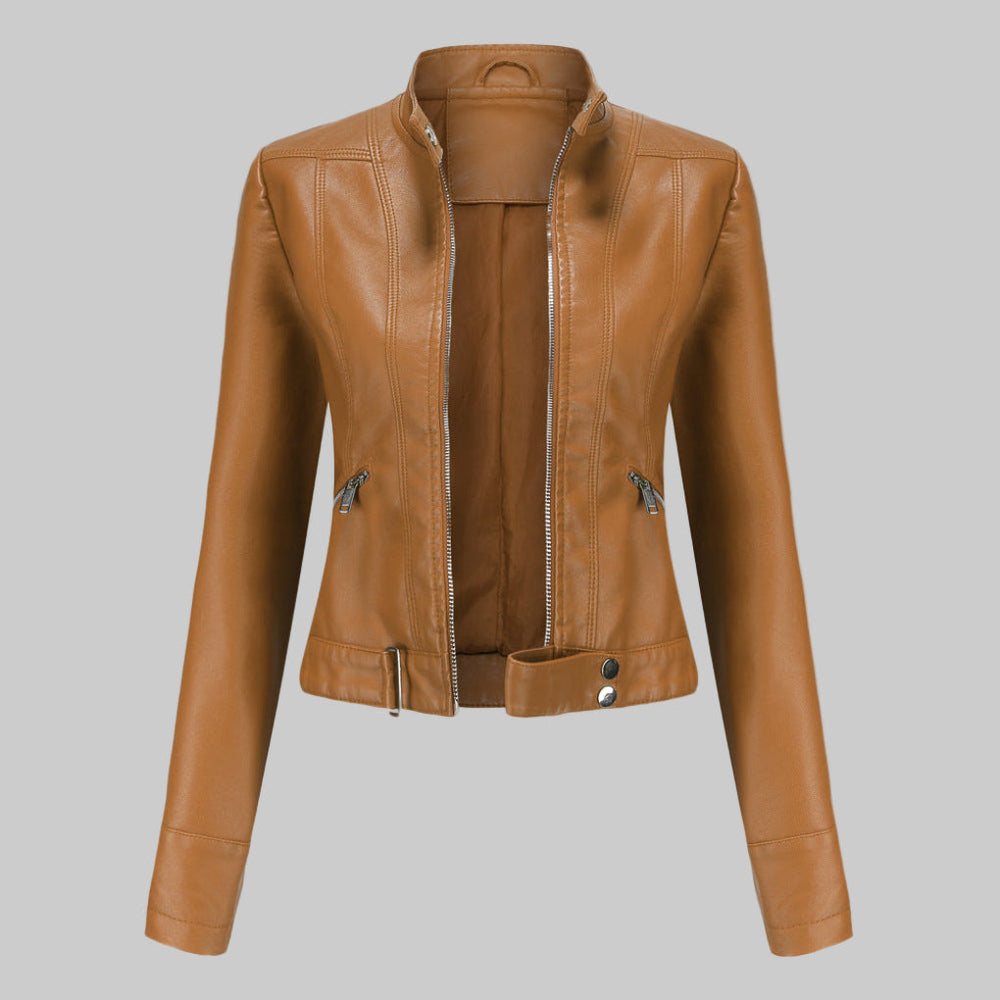 Grijze dames winterjas met capuchon, zwarte leren accenten en asymmetrische rits, ideaal voor koude weersomstandigheden.